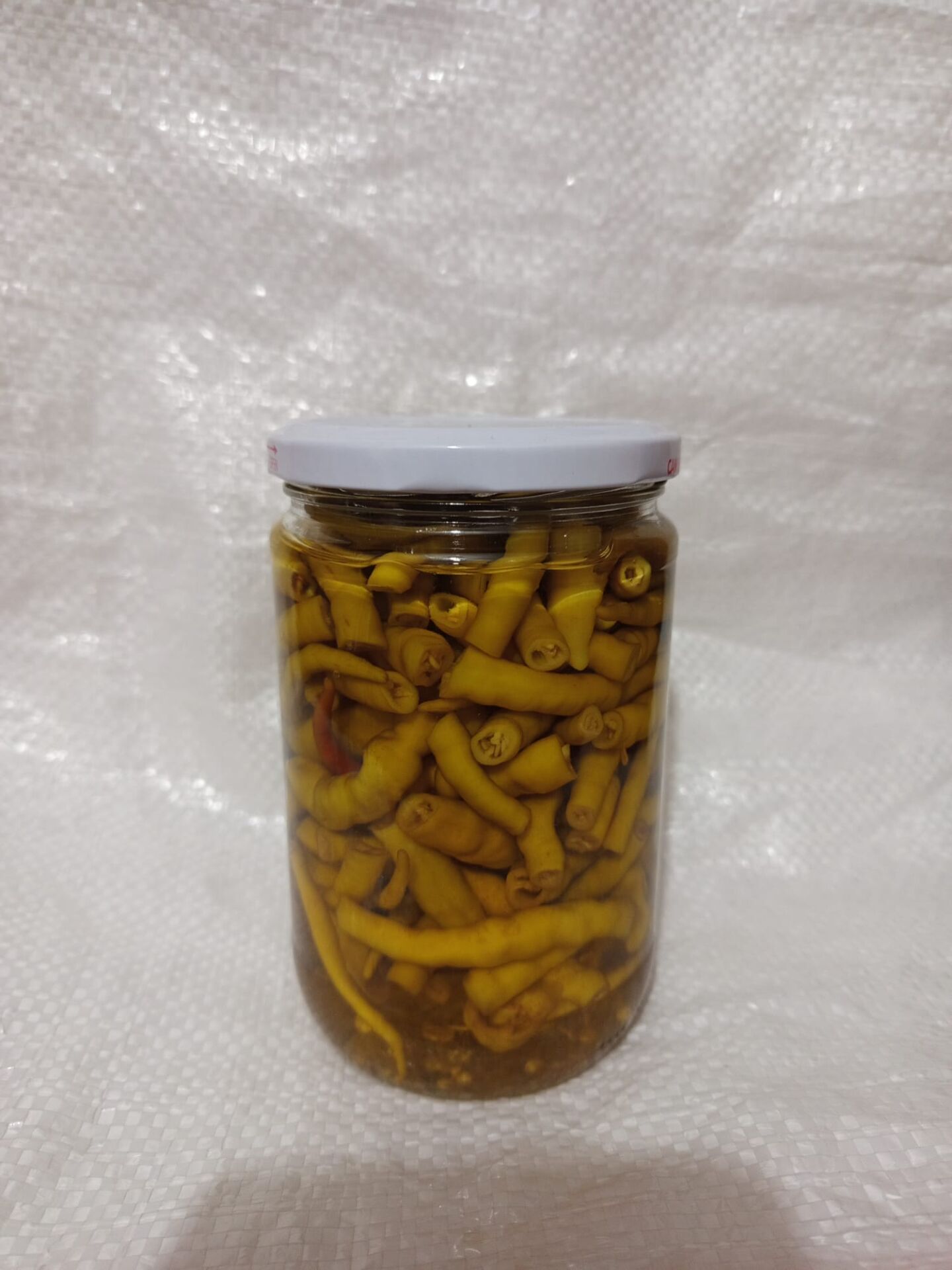 Kendi bahçemizden toplanan acı kıl biberlerden, sadece tuz ve sirke ile yapılmış, ev yapımı turşudur.